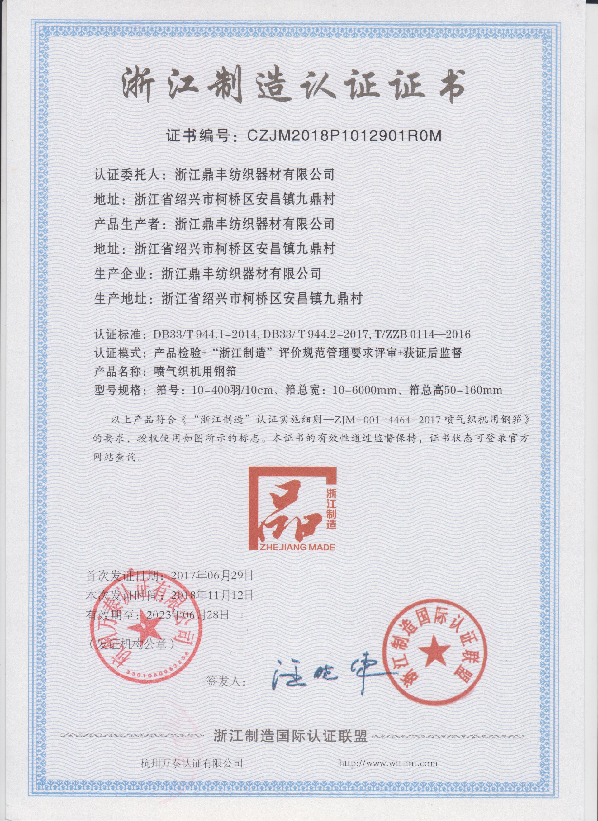 公司現(xiàn)有固定資產(chǎn)6000余萬元,員工300余人,現(xiàn)具有年產(chǎn)噴氣異型筘12萬米,劍桿筘32萬米,噴水筘5萬米,綜框20萬片,鋼片綜2億片,停經(jīng)片1.5億片, 織軸1.2萬套的生產(chǎn)能力。公司“越泉”商標被評為“中國馳名商標”。公司通過ISO9001 :2015國際質量體系認證,ISO14001:2015國際環(huán)境管理體系認證,ISO45001:2018國際職業(yè)健康安全管理體系認證,噴氣織機用鋼筘和織機用鋁合金綜框獲得“浙江制造”品牌認證,公司擁有自營進出口權,產(chǎn)品暢銷全國并遠銷印度、巴基斯坦、土耳其、埃及、哥倫比亞、意大利等國家和地區(qū)。